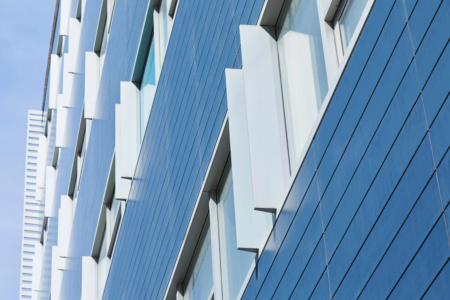 ….Windows and blue terracotta tiles create strong horizontal bands along the facade. The terracotta tiles are a German product, and are attached to the building with clips rather than adhesives. This allows the tiles to serve as a rainscreen. They have a self-washing, recyclable, non-combustible ceramic surface. This is the first application of the material in Western Canada. ..Les fenêtres et les tuiles de terre cuite bleues créent de fortes bandes horizontales le long de la façade. Les tuiles de terre cuite sont de fabrication allemande, et sont fixées au bâtiment à l’aide d’attaches plutôt que d’un adhésif, ce qui permet aux tuiles d’agir comme pare-pluie. Leur surface en céramique est auto-nettoyante, recyclable et non-combustible. C’est la première utilisation de ce matériau dans l’ouest du Canada. ….